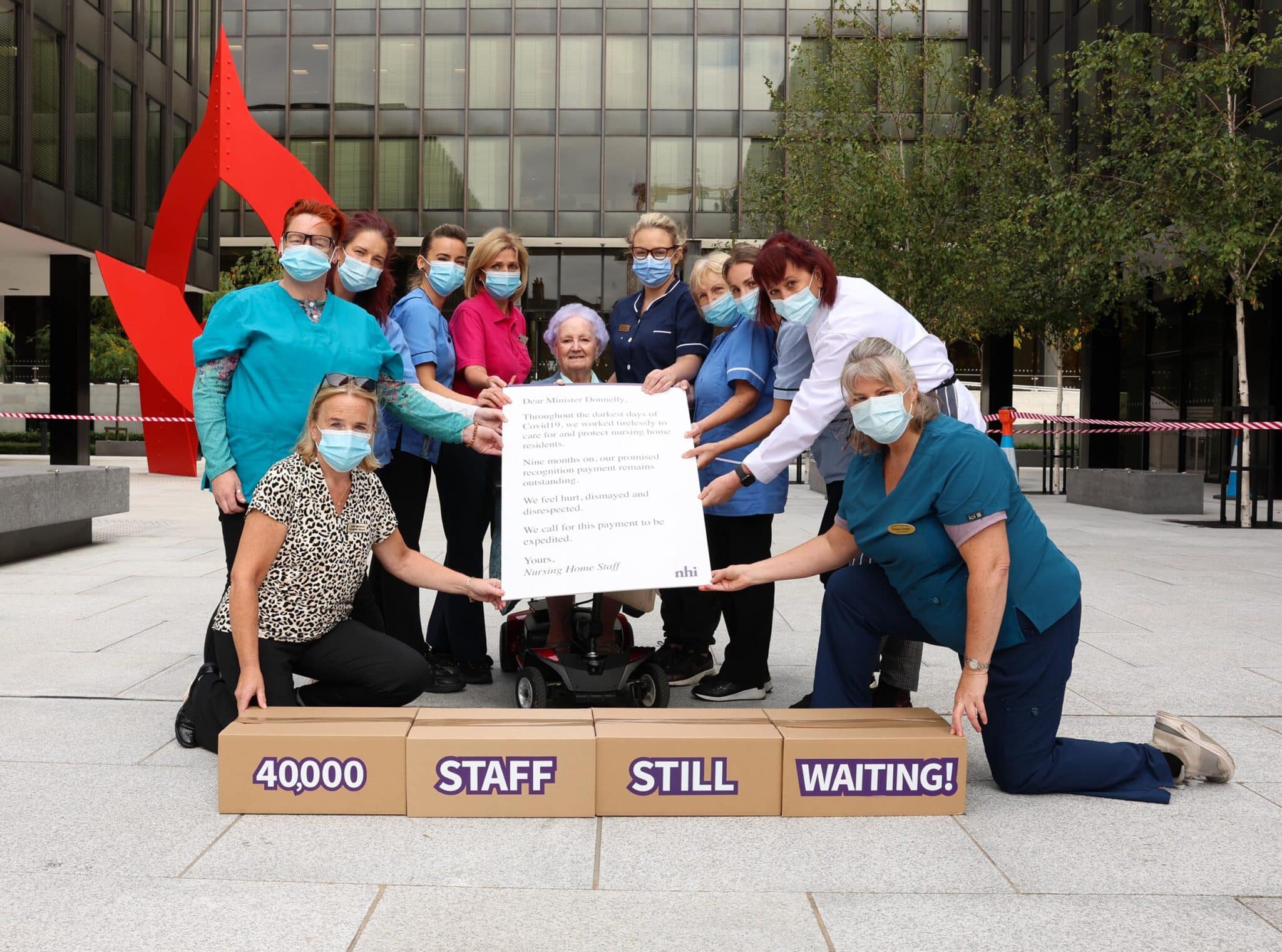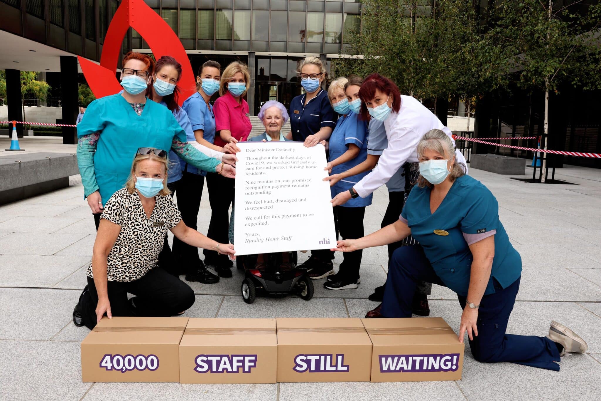 Tuesday October 11, 202211th October 2022: Over 2,000 letters from private and voluntary nursing home staff across the country are being delivered to the Department of Health calling for the Covid19 Pandemic Payment to be expedited. Nine months after it was announced by Government, 40,000 staff from nursing homes that were on the Covid19 frontline are still to receive the payment.