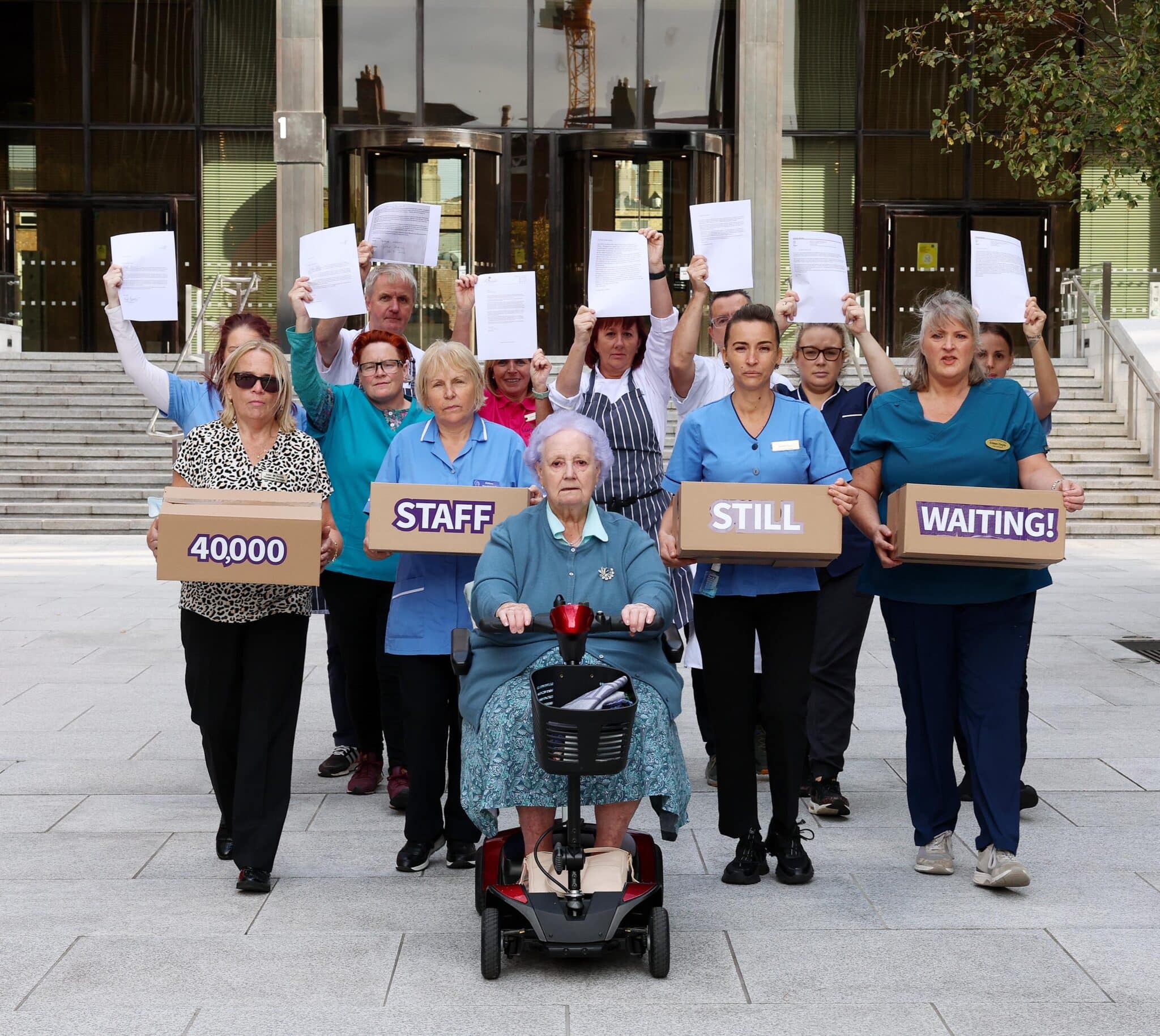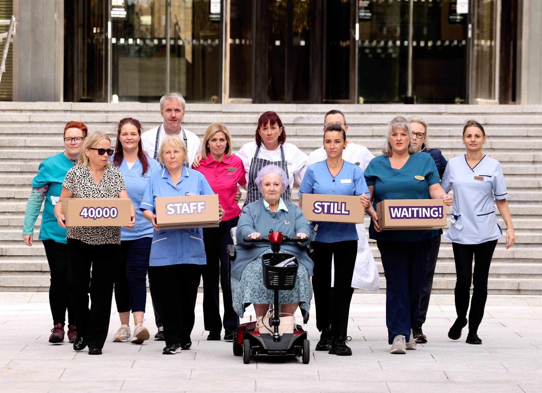 Staff from a range of disciplines within nursing homes will assemble at the Department of Health today at 12 noon for handover of the letters. They include nurses, carers, activity coordinators, catering and ancillary staff. Sister Mary Ward, a 94-year-old resident of Maryfield Nursing Home in Chapelizod, Dublin, is also attending to lend her support.